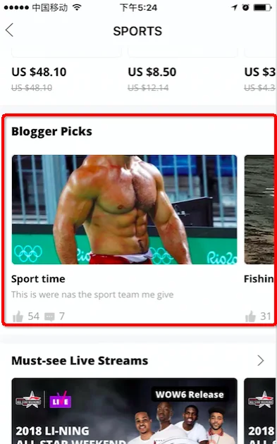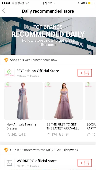 另外Discover下还会有2个推荐板块,一个是Daily recommend store,里面会包括三个维度的店铺推荐:本周销量最高、本周增粉最多以及本周点赞最多,具体展示效果如下图: