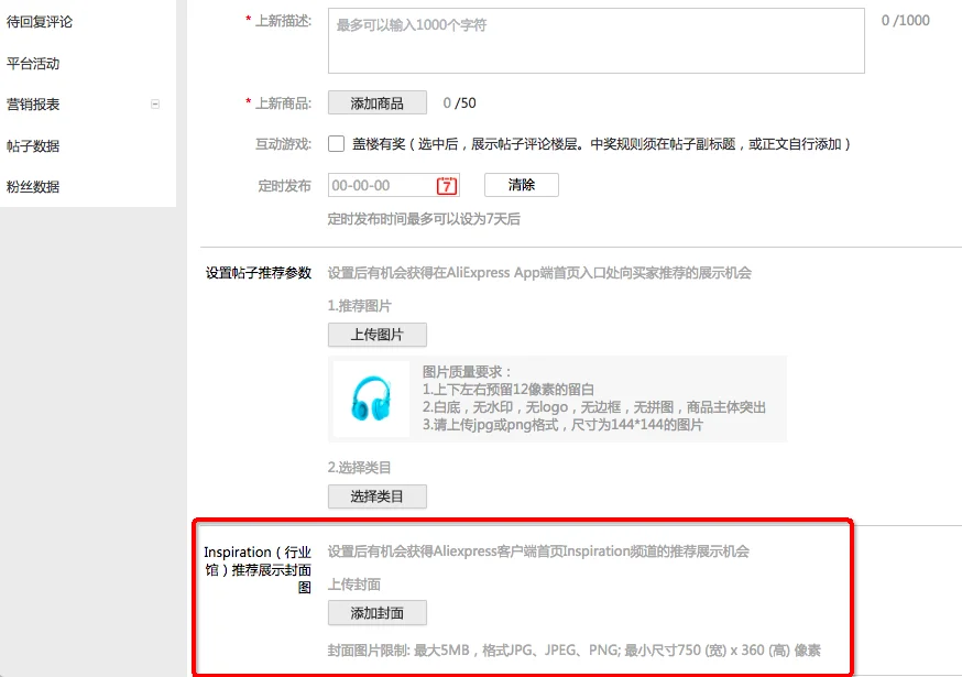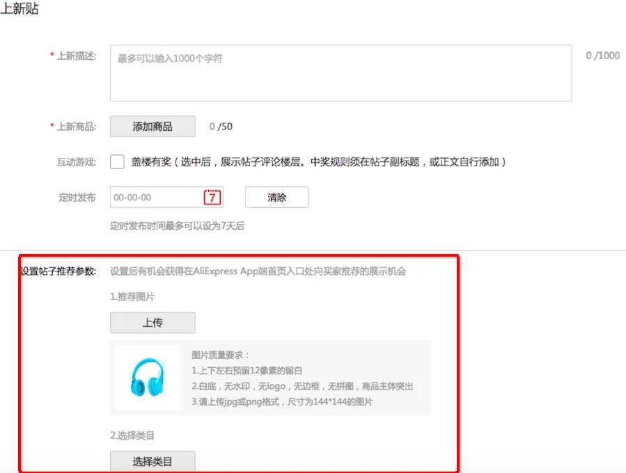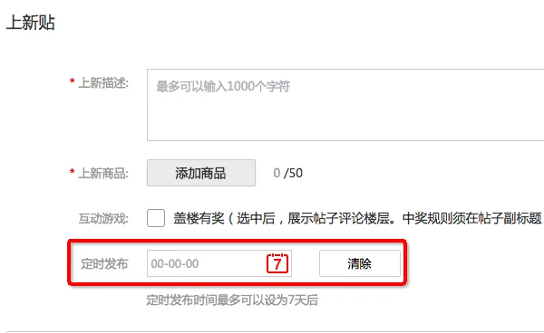 所有的发帖类型都支持定时发布,定时发布的时间点设置是中国时间,具体设置操作入口以新品帖发布为例,如下图: