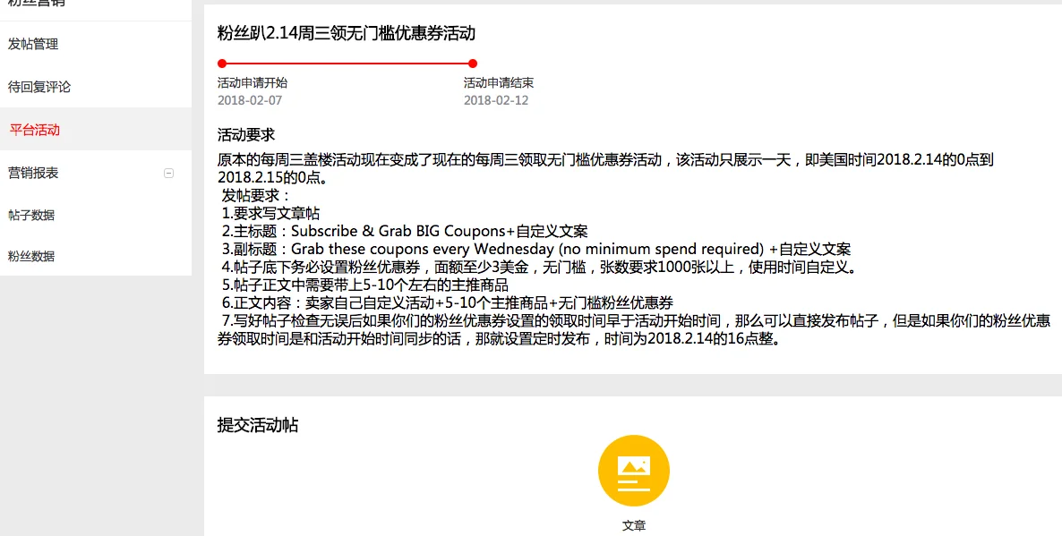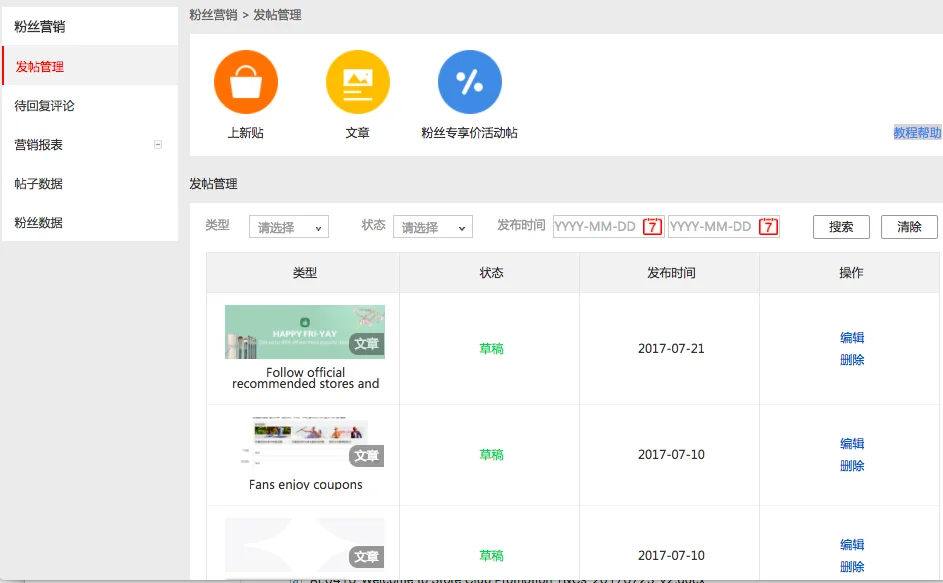 具体操作是进入卖家后台-营销活动-客户管理-粉丝营销,进入之后点击发帖管理菜单下的文章,如下图