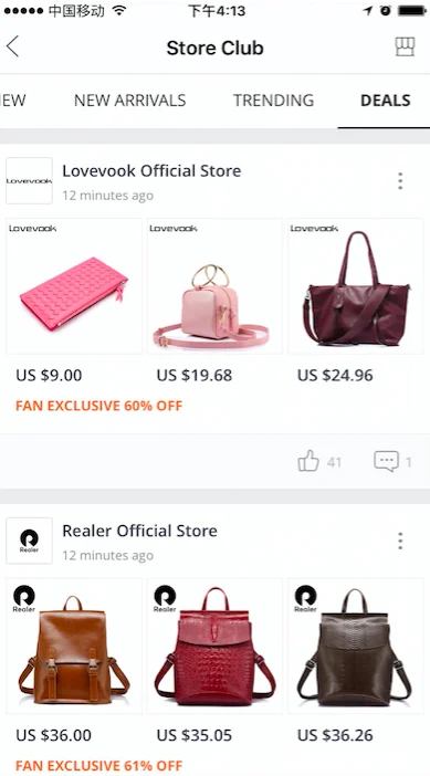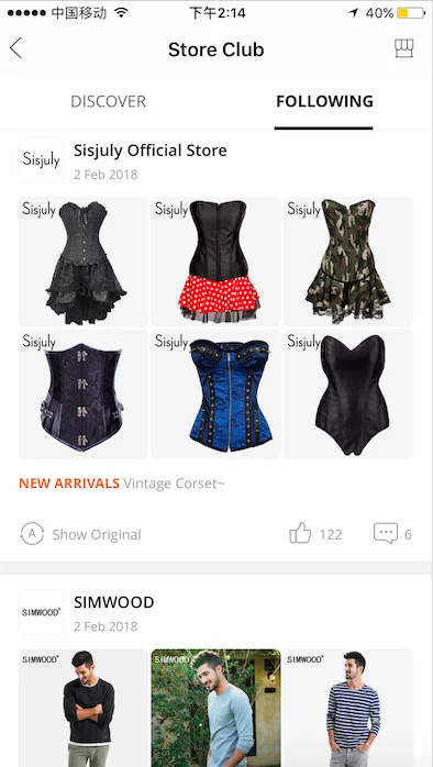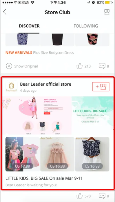 Store Club频道内容分为发现(Discover)和关注(Follow)两部分内容,默认进入频道是Discover,里面展示的内容是粉丝趴优质卖家发布(优质卖家入选规则请点此查看)的营销内容,包括上新,粉丝专享活动,导购文章以及活动等,以及其他所有卖家发布的优质内容(优质内容标准请点此查看),基于买家做个性化推荐展示,展示效果如下图: