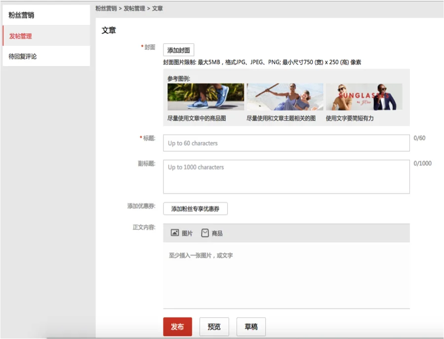 进入操作后台之后可以看到3个内容发布入口,上新帖、文章以及粉丝专享价活动帖,如下图: