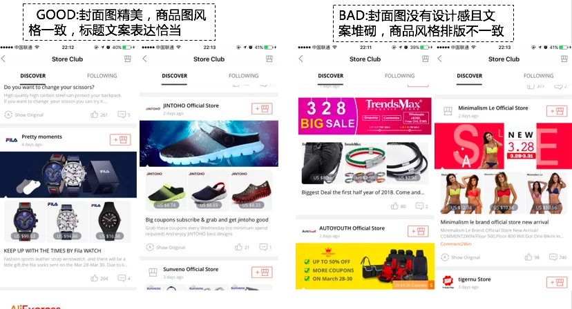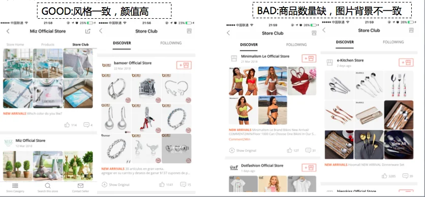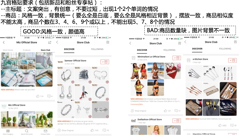 如需要获得Store Club 频道的展示机会,选择的新品的相似度不能太高,且商品数量3/4/6/9及以上,不能出现5/7/8个商品的情况,新品的主图要求如下:主图背景的一致性、商品摆放规则的一致性、不允许使用拼图或者出现牛皮癣,优质和低质新品帖的对比图如下,给大家做一个参考: