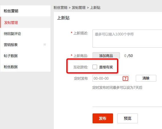 新品帖以及文章帖都支持盖楼内容发布,在发布新品或者文章帖的时候将互动游戏:盖楼有奖的选项勾选上即可,目前盖楼有奖的活动只是提供了一个楼层展示的功能,所以勾选了此选项的帖子内容下需要包含盖楼有奖的活动内容,包括奖品以及获奖方式等信息,如下图所示: