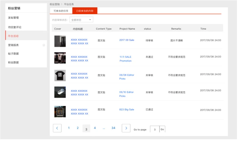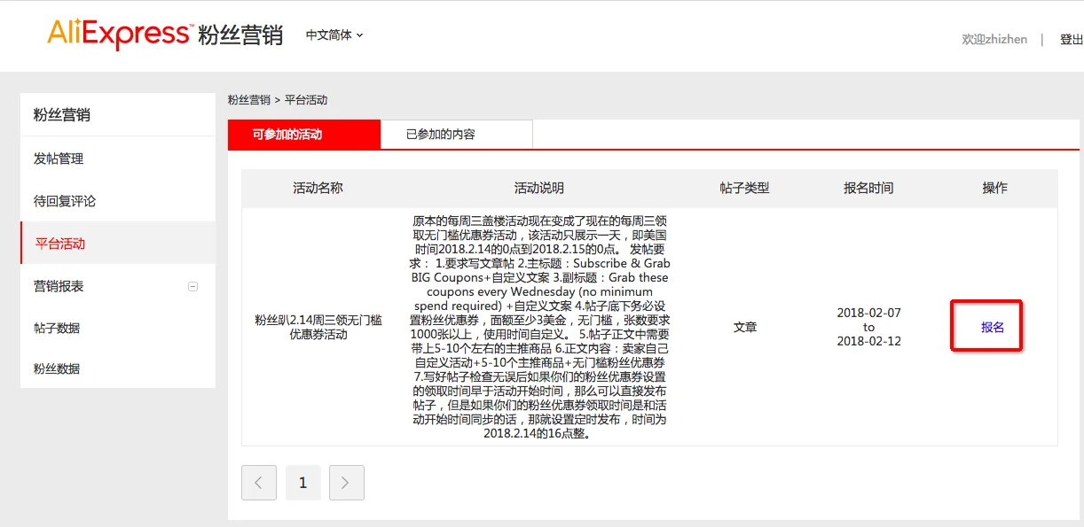 平台活动报名入口:请登录粉丝营销-平台活动,进入之后可以看到您可参加的活动列表,如列表为空,则说明当前没有可报名的活动,具体效果如下图所示: