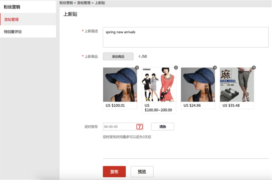 上新帖发布需要注意的点是:添加商品的数量需要控制,可添加3-50个新品,且尽量选择新发布商品,使用定时发布功能时需要注意,最多可以设为7天后发布,发布前请使用预览功能查看效果,确认无误后操作发布。