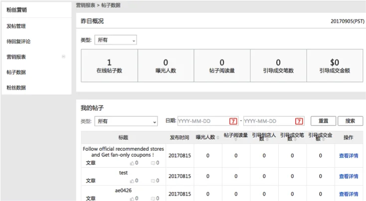 4、引导成交笔数:用户访问过帖子A的详情页,且当天(美国时间范围内的当天)在帖子A所在店铺的任何商品产生了一个订单,则会记录一笔帖子A的引导成交。