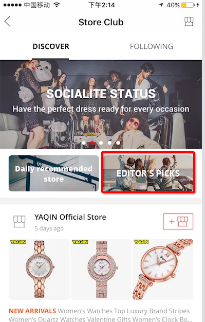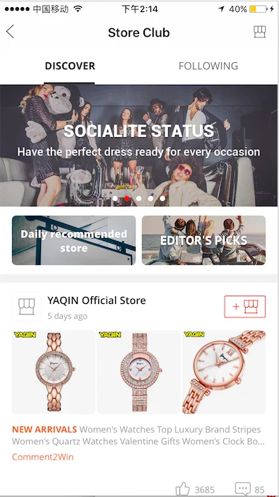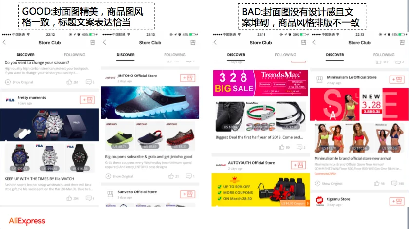 Store Club 是AliExpress平台为广大卖家提供的粉丝营销阵地,功能类似淘宝的“微淘”,基于买卖家的关注关系进行内容展示。 关注店铺的买家可以收到卖家发布的动态信息,包括店铺上新,买家秀,粉丝专享活动,导购文章等,此外获得了直播权限卖家的直播视频也会同步展示到频道内,且支持买家对相应的内容进行点赞和评论。