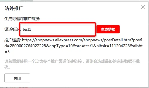 点击站外推广之后,进入自定义设置渠道标识页面,进入之后设置一个你可识别的标识点击生成链接即可获得可跟踪的渠道推广链接,需要注意的是渠道标识只支持英文和数字,需要控制在20个字符以内,操作示范见下图