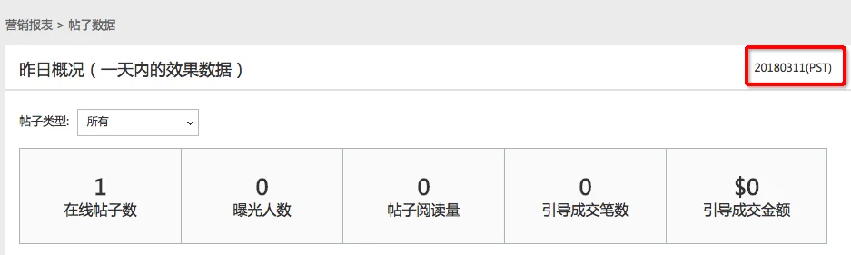 粉丝趴营销报表包括2部分数据,分别是帖子数据和粉丝数据,需要注意的是帖子数据报表下我们只展示最近30天有访问行为的帖子数据,如在线的帖子最近30天内没有被访问的记录则这个帖子的数据就不会出现在数据报表中,另外看数据我们首先关心的是数据的统计时间,粉丝趴营销报表的数据统计时间都是美国时间,数据查询页面上会有数据的统计时间展示,如下图红框内的日期就是当前报表数据的统计时间: