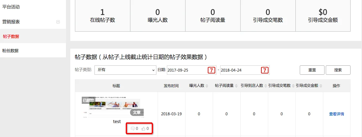7、上图标红区域是帖子的点赞和评论数据,这两个数据指标都是累计的,展示的数字截止到统计日期的累计数据