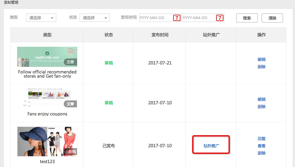 我们先来看一下生成可跟踪的渠道推广链接的操作,登陆粉丝趴发帖后台,找到您已经发布的帖子,对应帖子下会有一个站外推广操作,如下图: