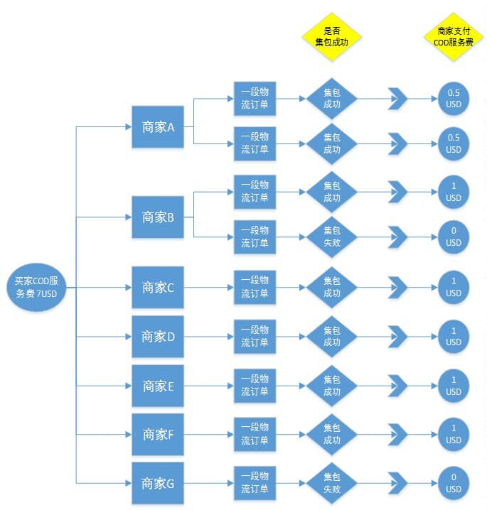 4、COD 服务费指消费者从多个商家处购买商品且与商家缔结了包含石油集运 COD 服务的消费订单,则 COD 服务费将在所有参与该订单的卖家间、在封顶报价(7 美金)下进行平均分摊。