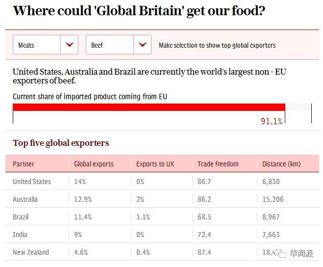 美国、澳大利亚和巴西是全球最大的牛肉出口国,而英国每年从欧盟进口牛肉的比例高达91.1%,却从未从美国进口过牛肉,从澳大利亚和巴西进口牛肉比例为2%和1.1%。