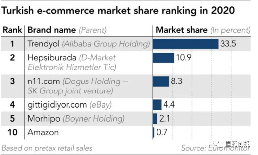 除了Trendyol之外,土耳其电商玩家还包括了刚在美国上市不久的Hepsiburada、土耳其财团Dogus Group与韩国SK集团合作的N11.com(以前印尼的Elevenia和马来西亚/泰国的11Street也是这个系列的)、eBay投资的Gitti Gidiyor、以及土耳其本土时装零售集团旗下的Morhipo。 而国际电商巨头亚马逊则排到了第十。